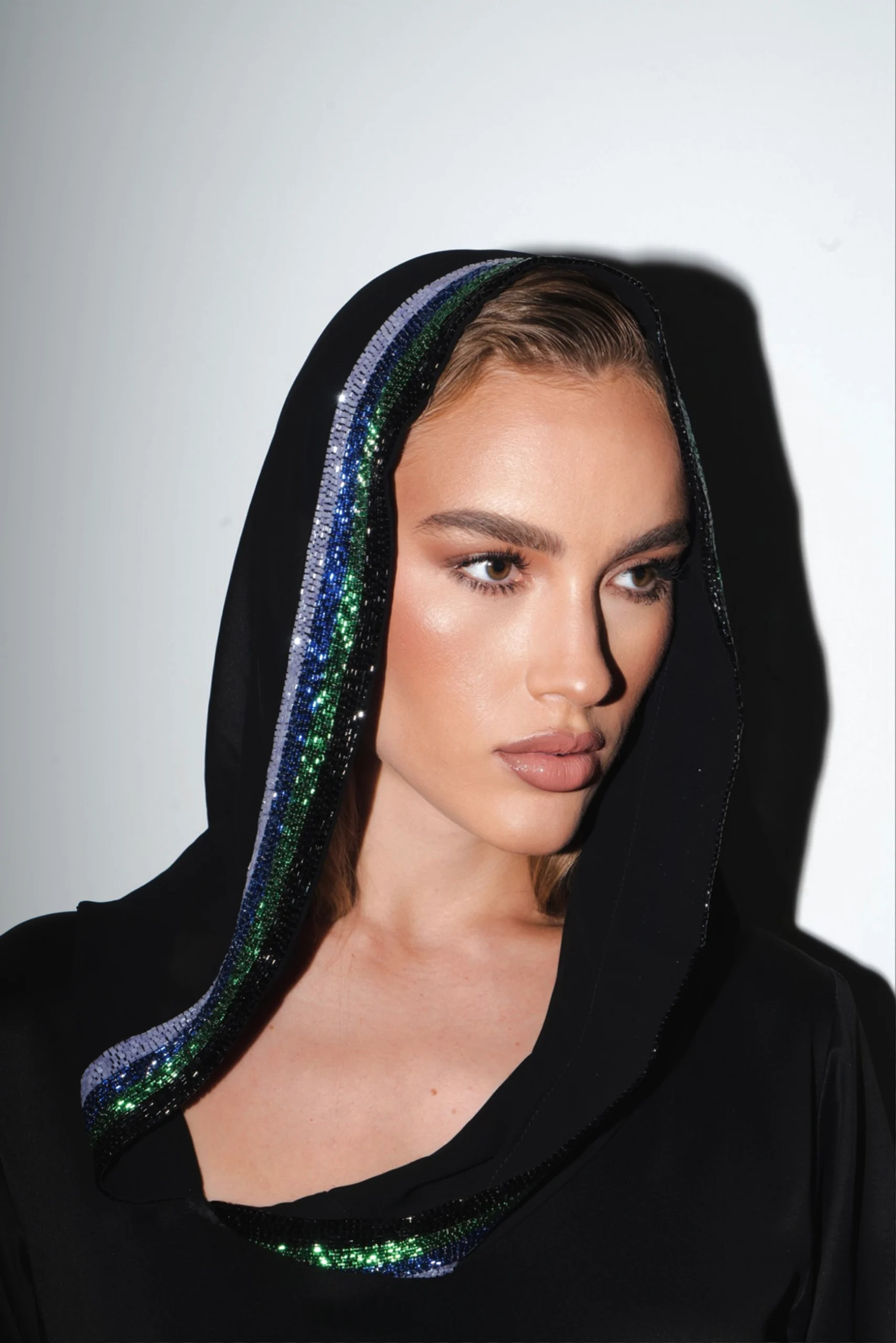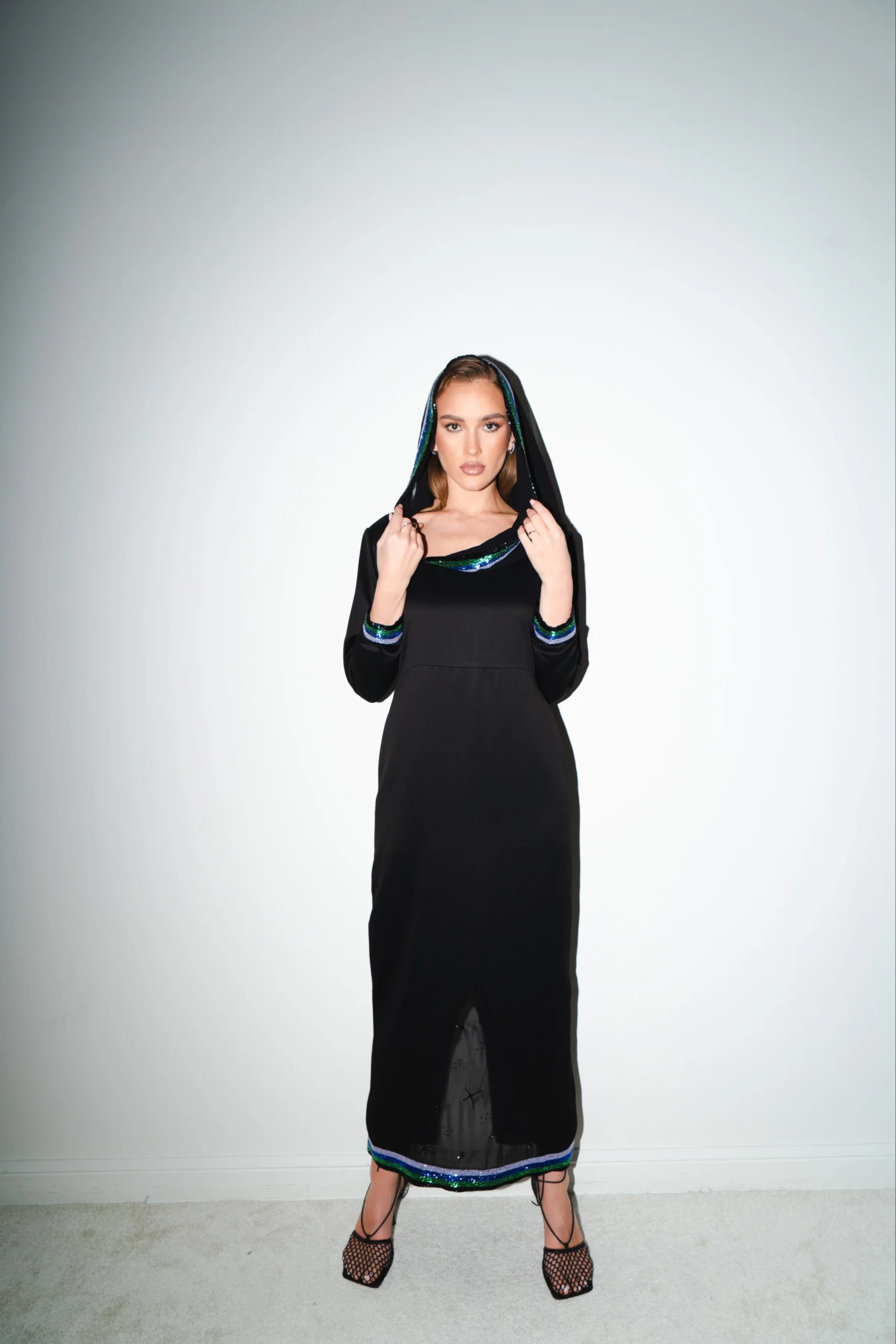 A sleek black, floor-length silhouette accented with subtle iridescent detailing. Finished with a softly draped hood and clean lines, this design blends understated drama with modern elegance.