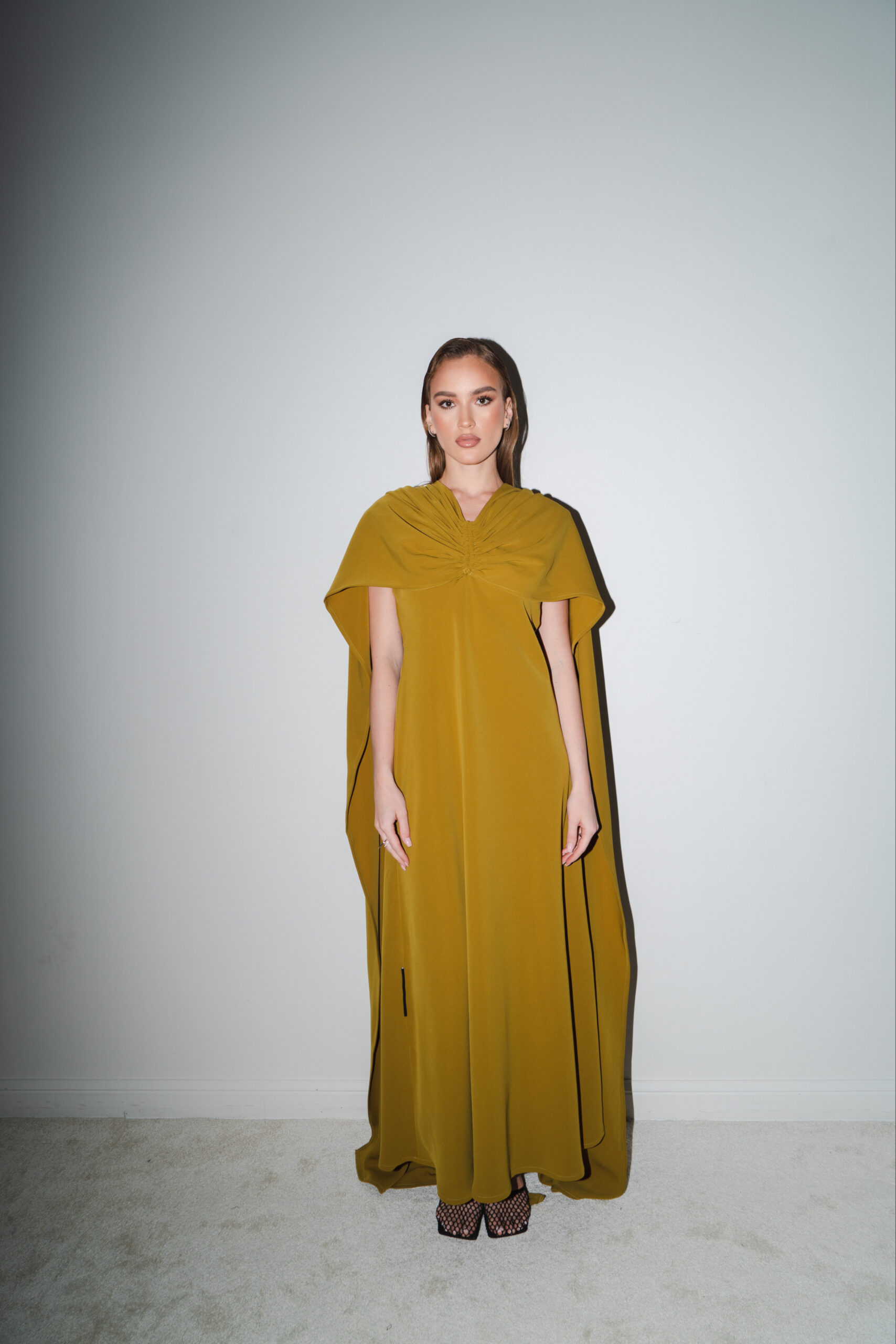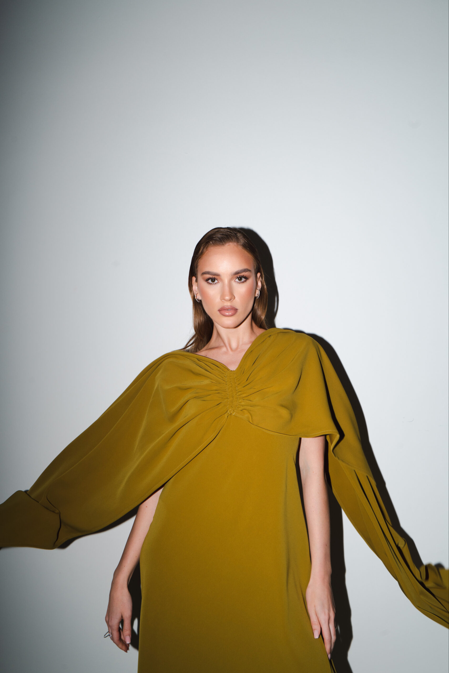 A flowing, floor-length silhouette in warm olive tones, featuring soft draping and a gently gathered neckline. Effortless and elegant, this design offers a graceful balance of movement, comfort, and modern sophistication.