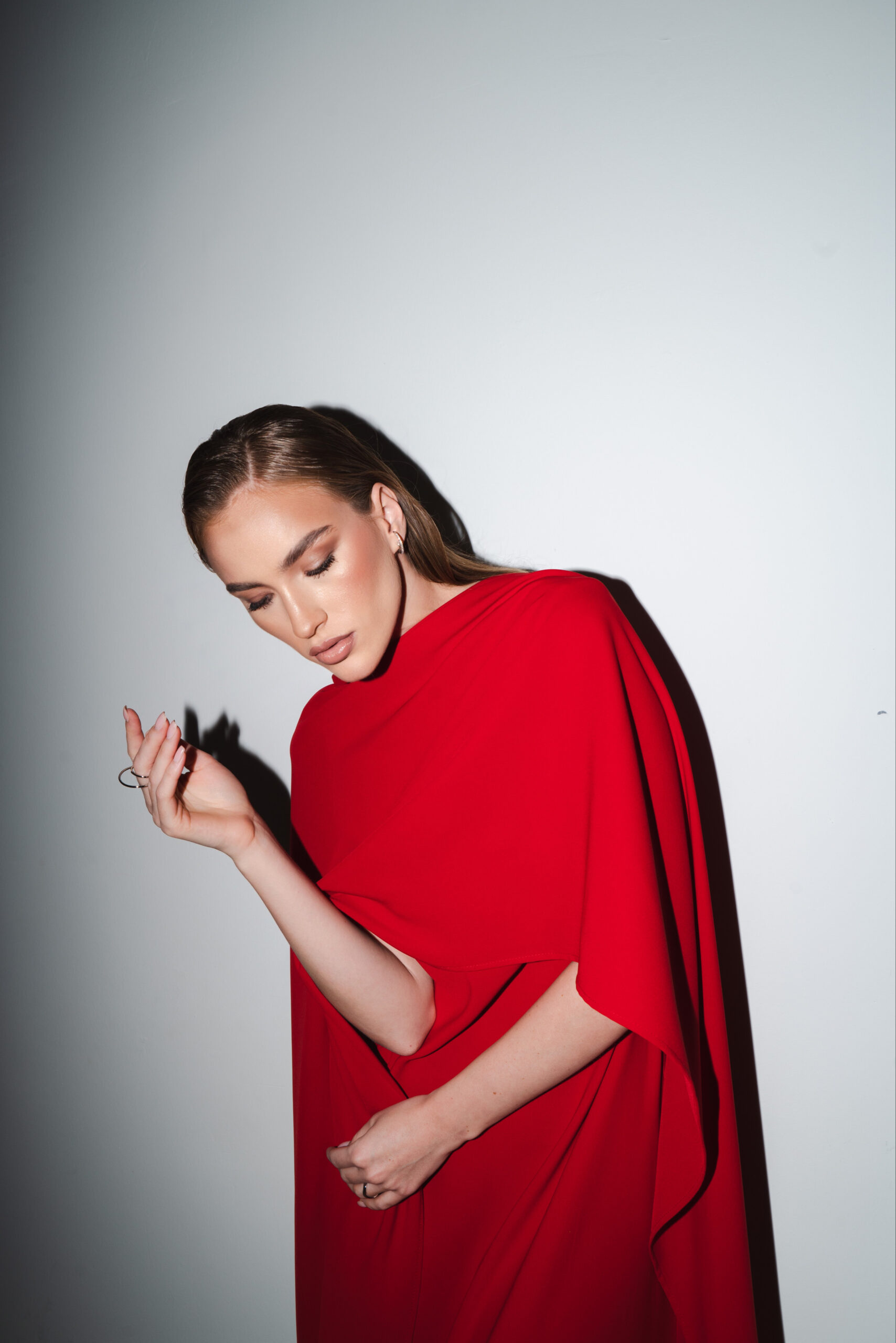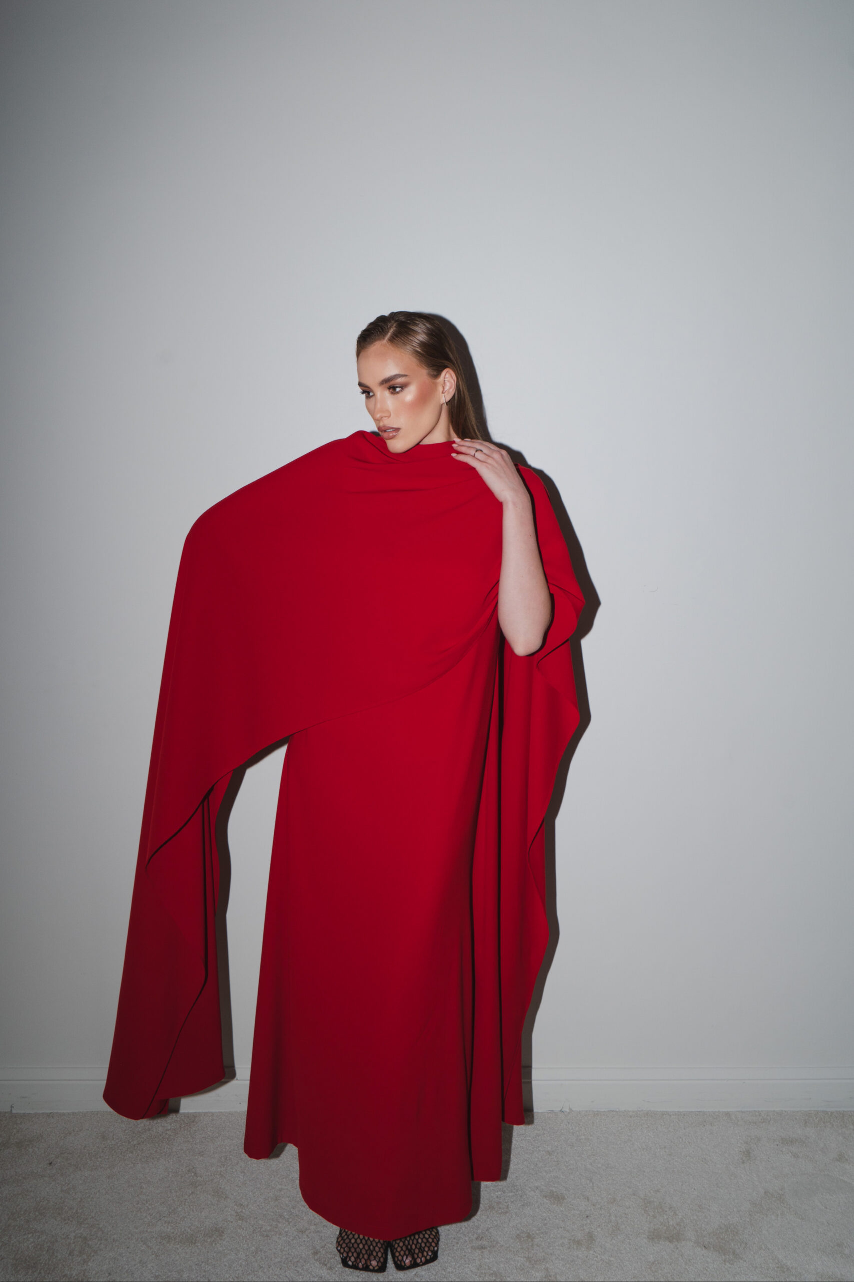 A sculptural, floor-length silhouette deep crimson, defined by dramatic draping and an elegant, wrap-style form. Bold yet fluid, this design embodies modern sophistication with a powerful, graceful presence.