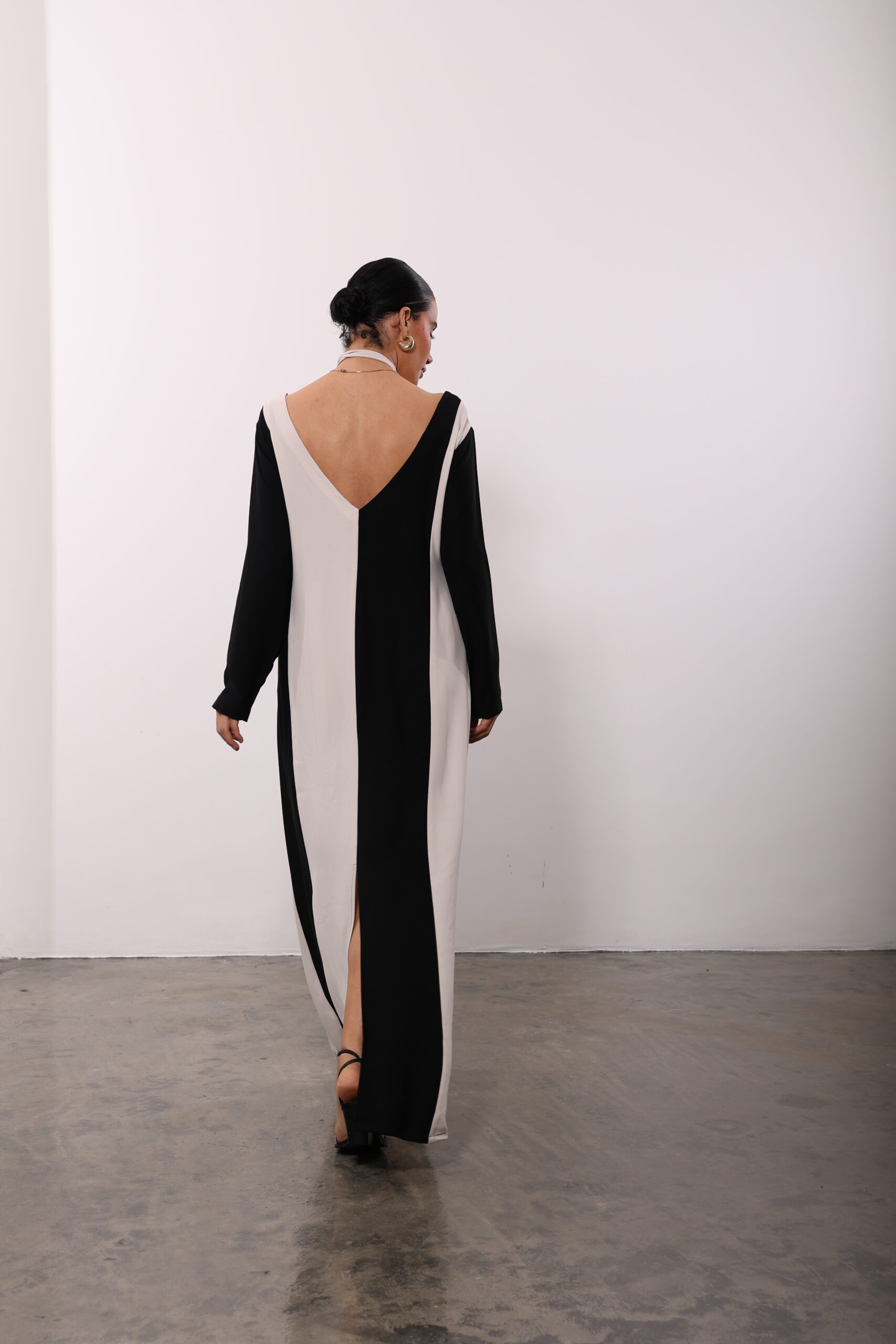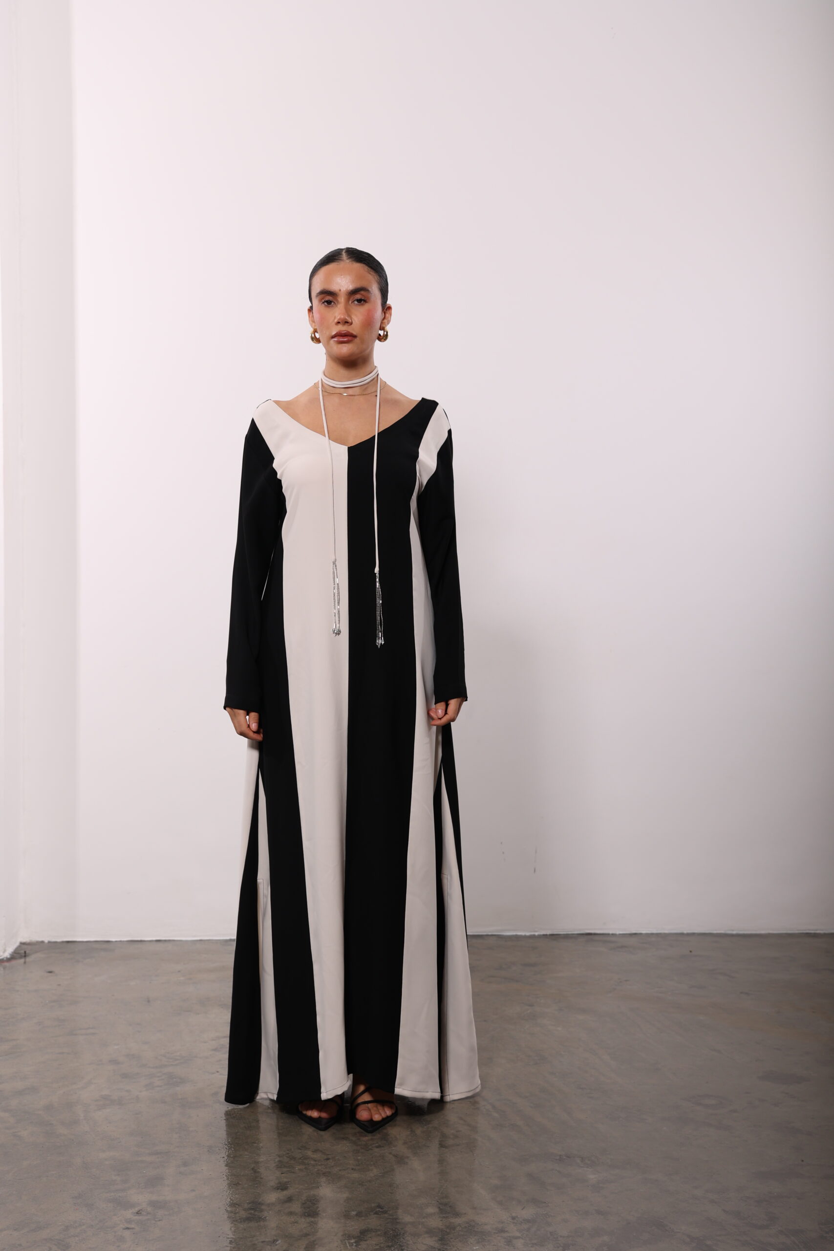 A striking floor-length silhouette defined by bold black-and-ivory vertical panels. Featuring a soft V-neckline, fluid lines, and subtle slit detailing, this design delivers modern elegance with a timeless, graphic edge.