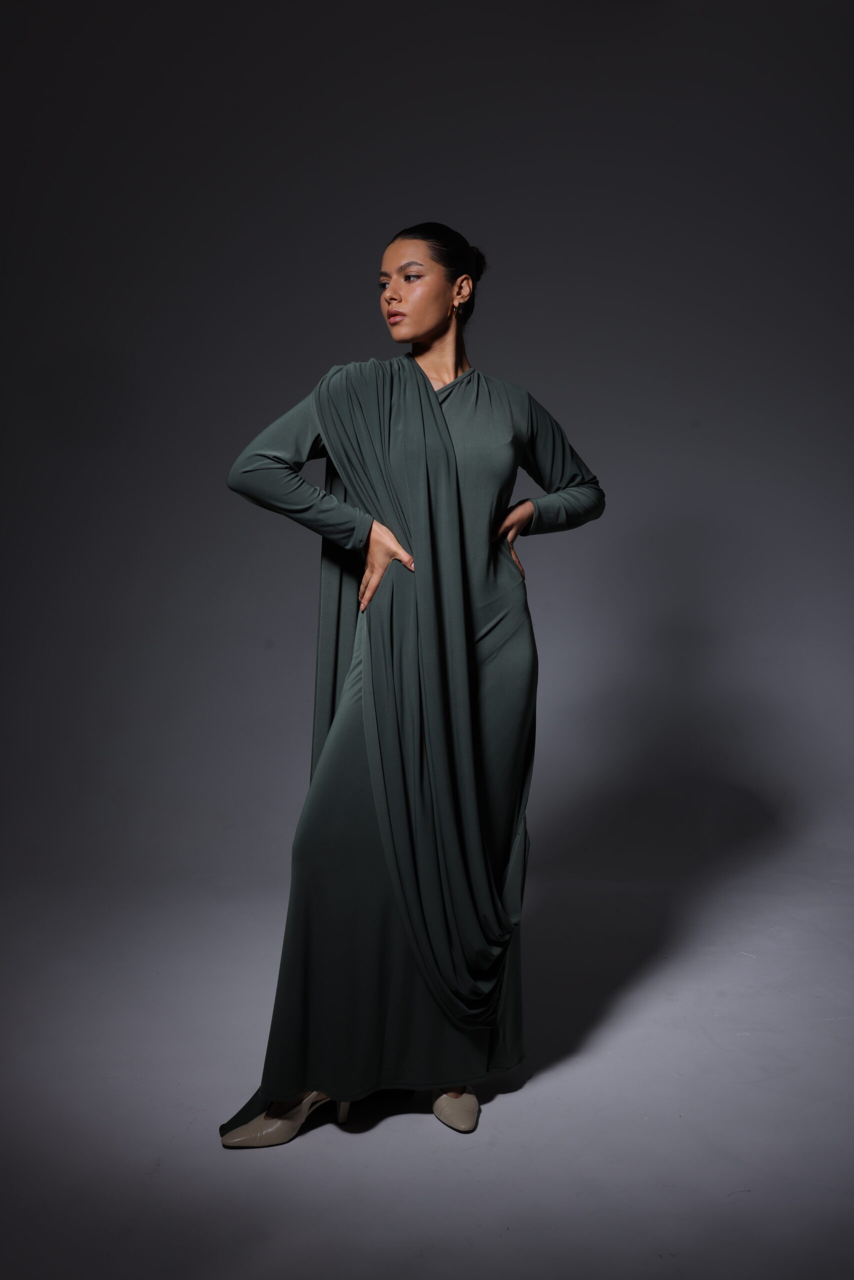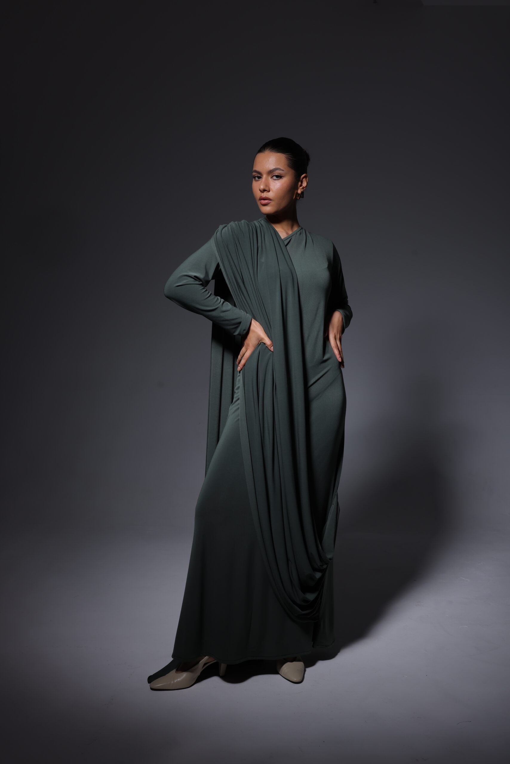 A softly draped silhouette in muted olive tones, featuring elegant pleating and a fluid, floor-length design. The wrap-style detailing creates natural movement, offering a modern expression of understated sophistication and effortless grace