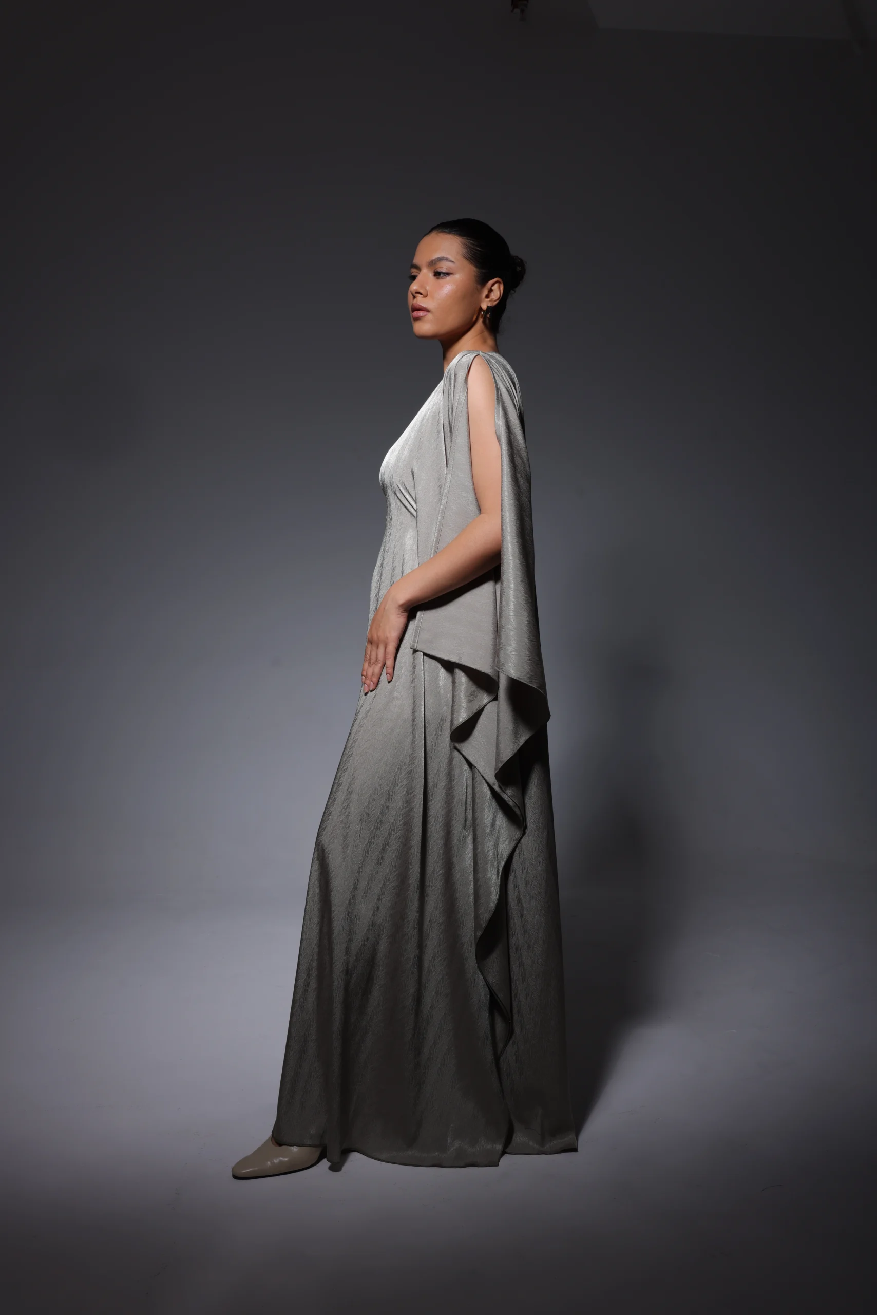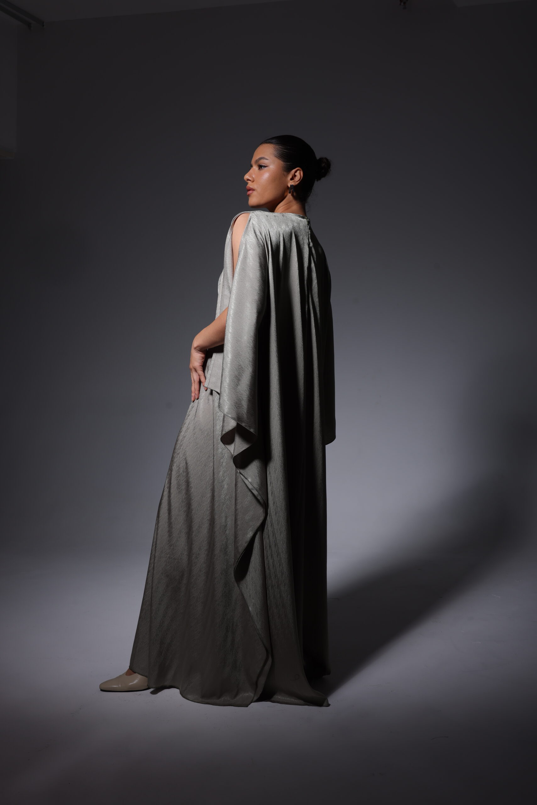 A luminous, fluid silhouette in soft green, featuring wide draped sleeves and a gently flowing floor-length form. Subtle sheen and minimalist lines come together to create a look of quiet elegance and timeless sophistication.