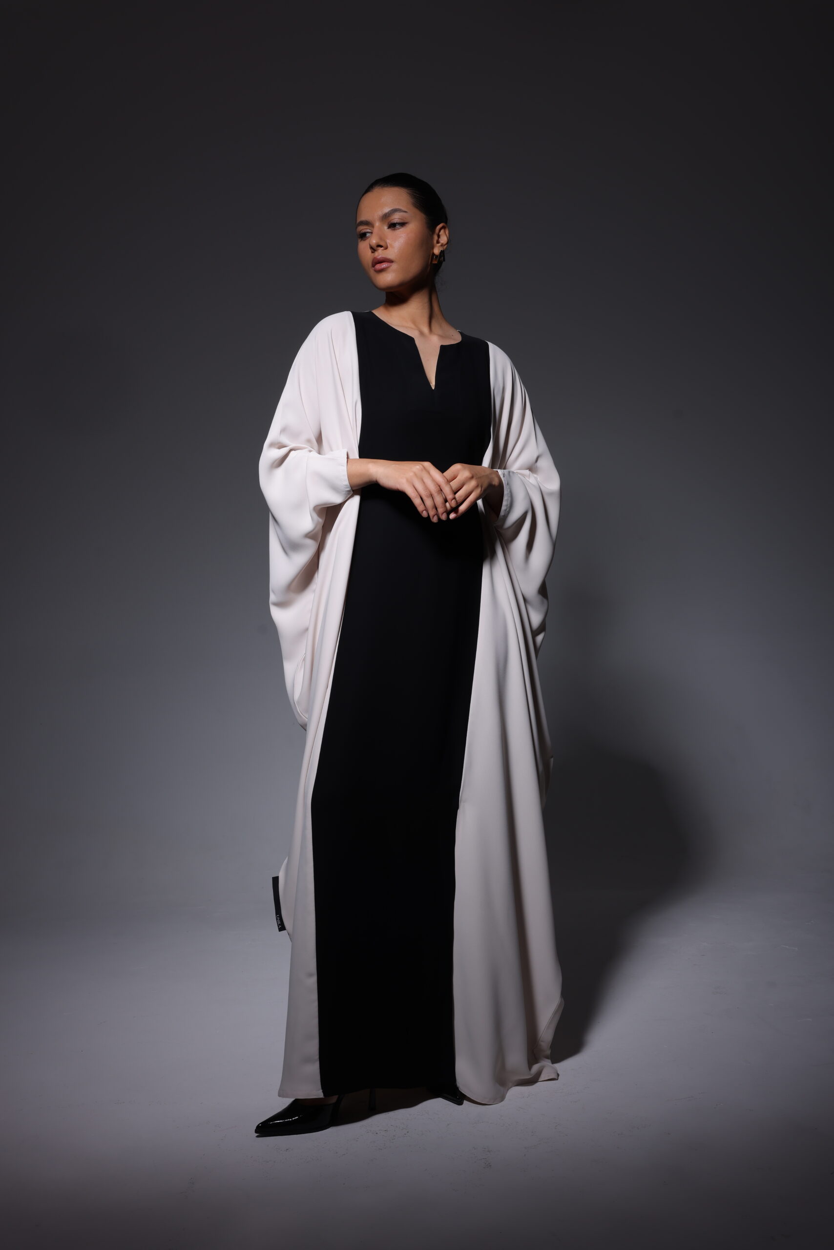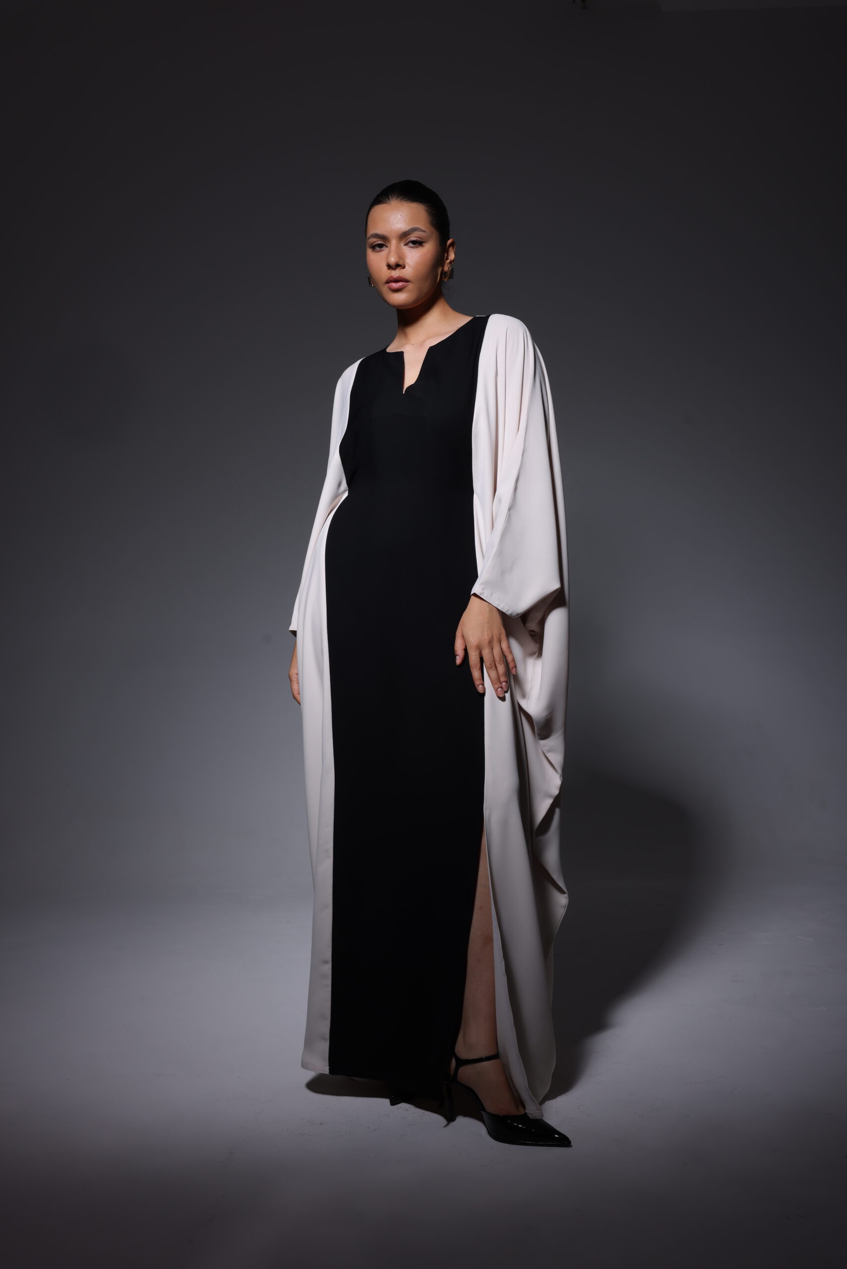 A striking contrast of black and soft ivory defines this elegant, floor-length design. Featuring fluid draped sleeves and a clean, structured center panel, the silhouette balances modern minimalism with timeless sophistication
