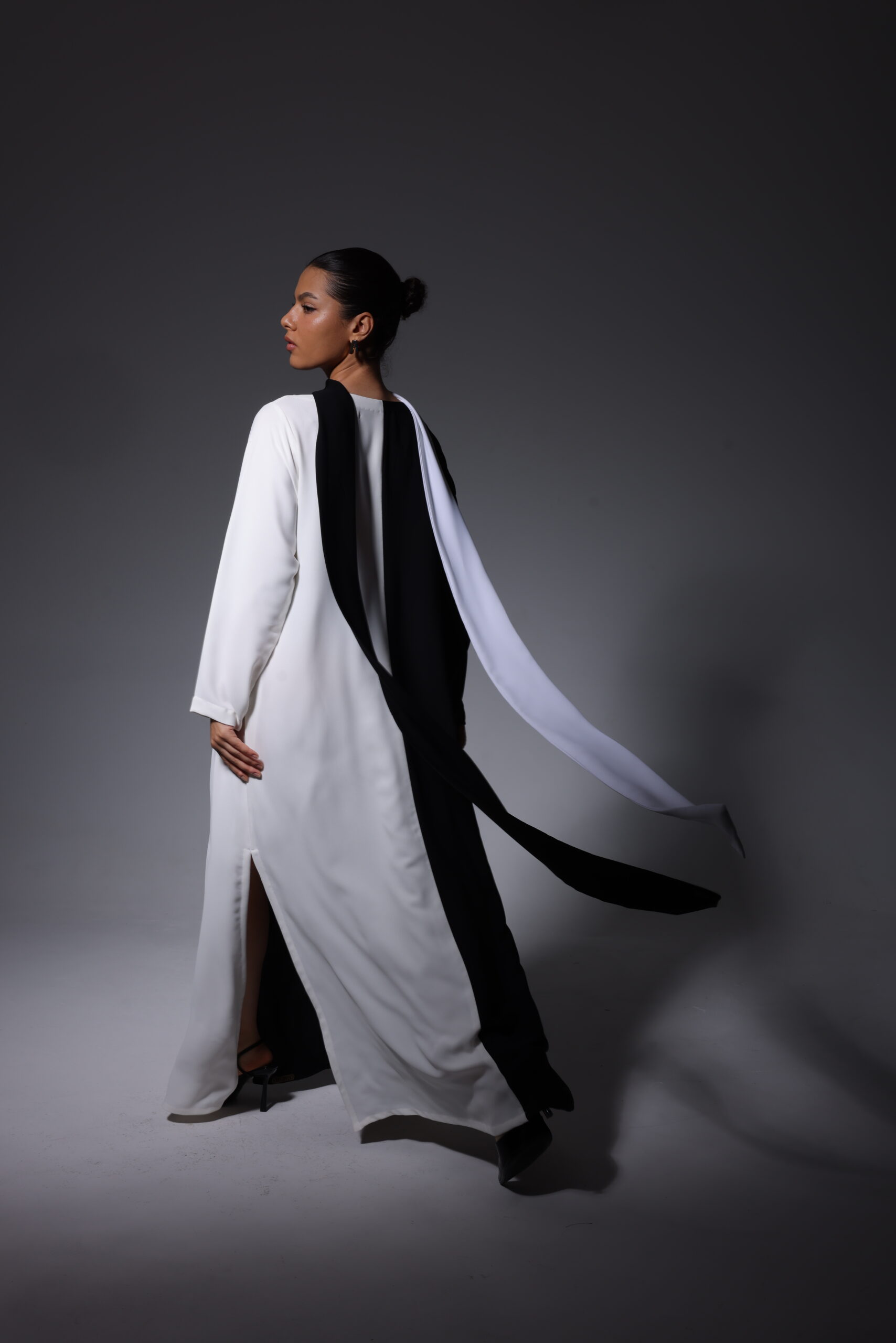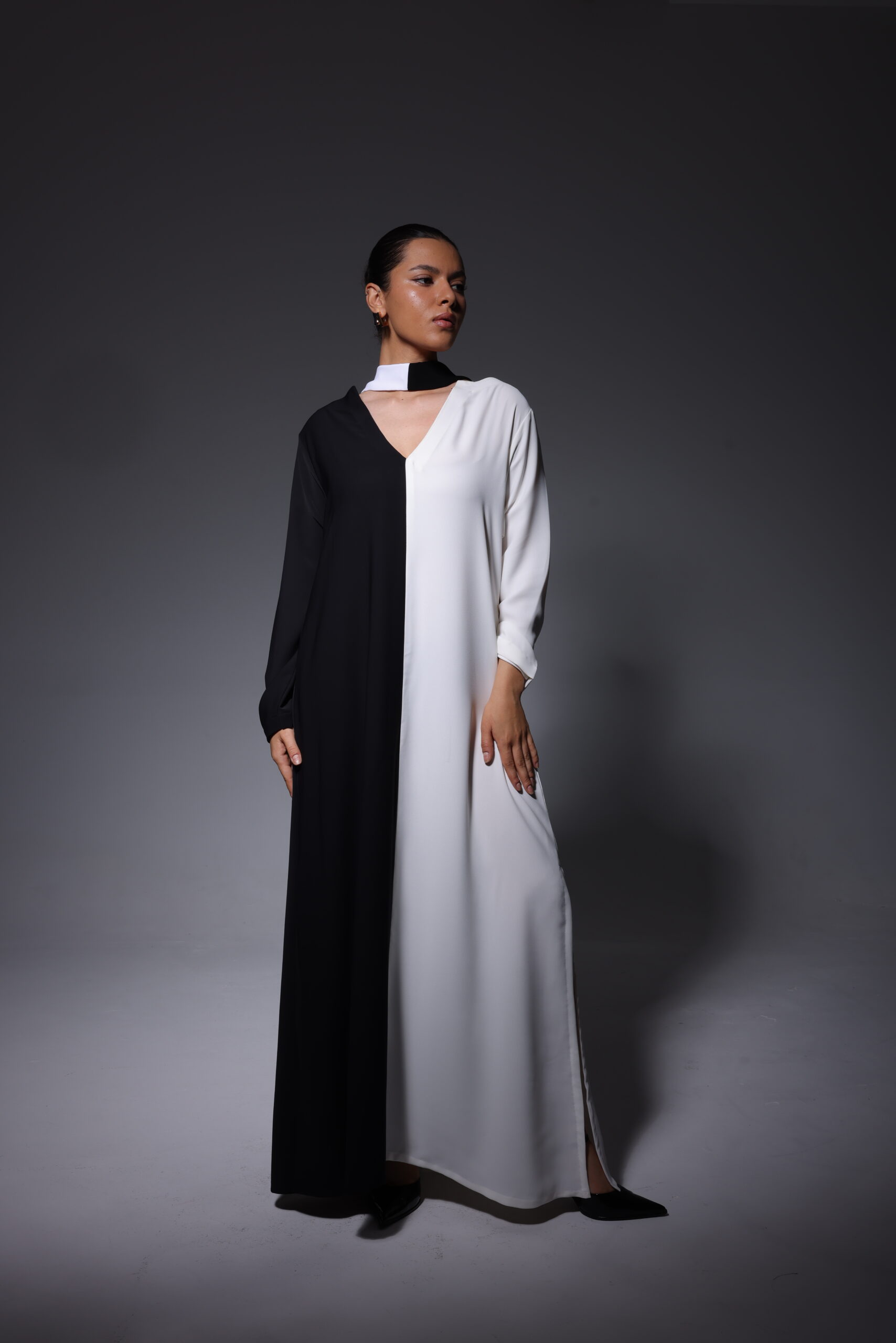 A bold monochrome silhouette in black and ivory, defined by a clean vertical split and fluid, floor-length lines. Finished with a subtle neckline detail, this design embodies modern elegance with striking simplicity.
