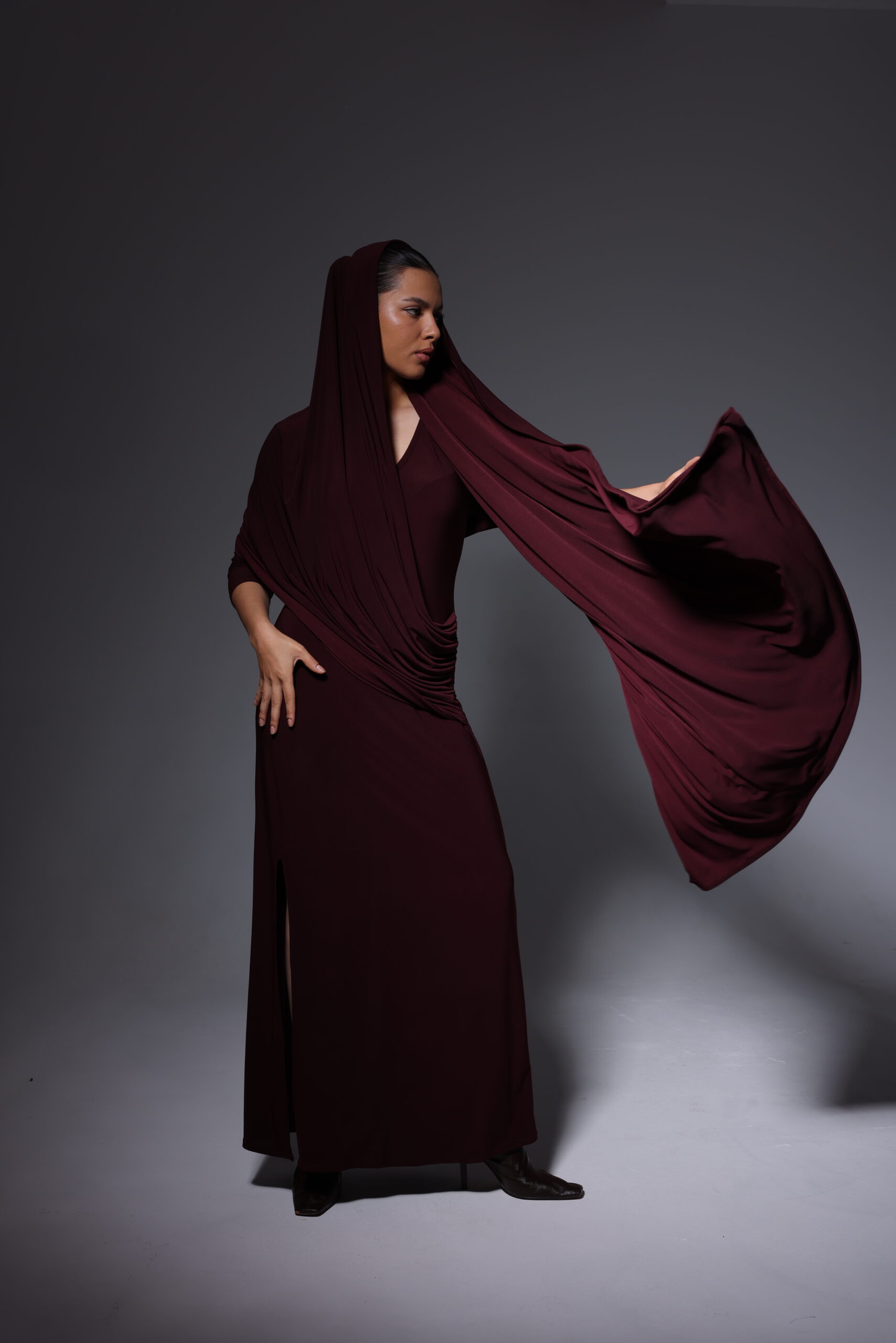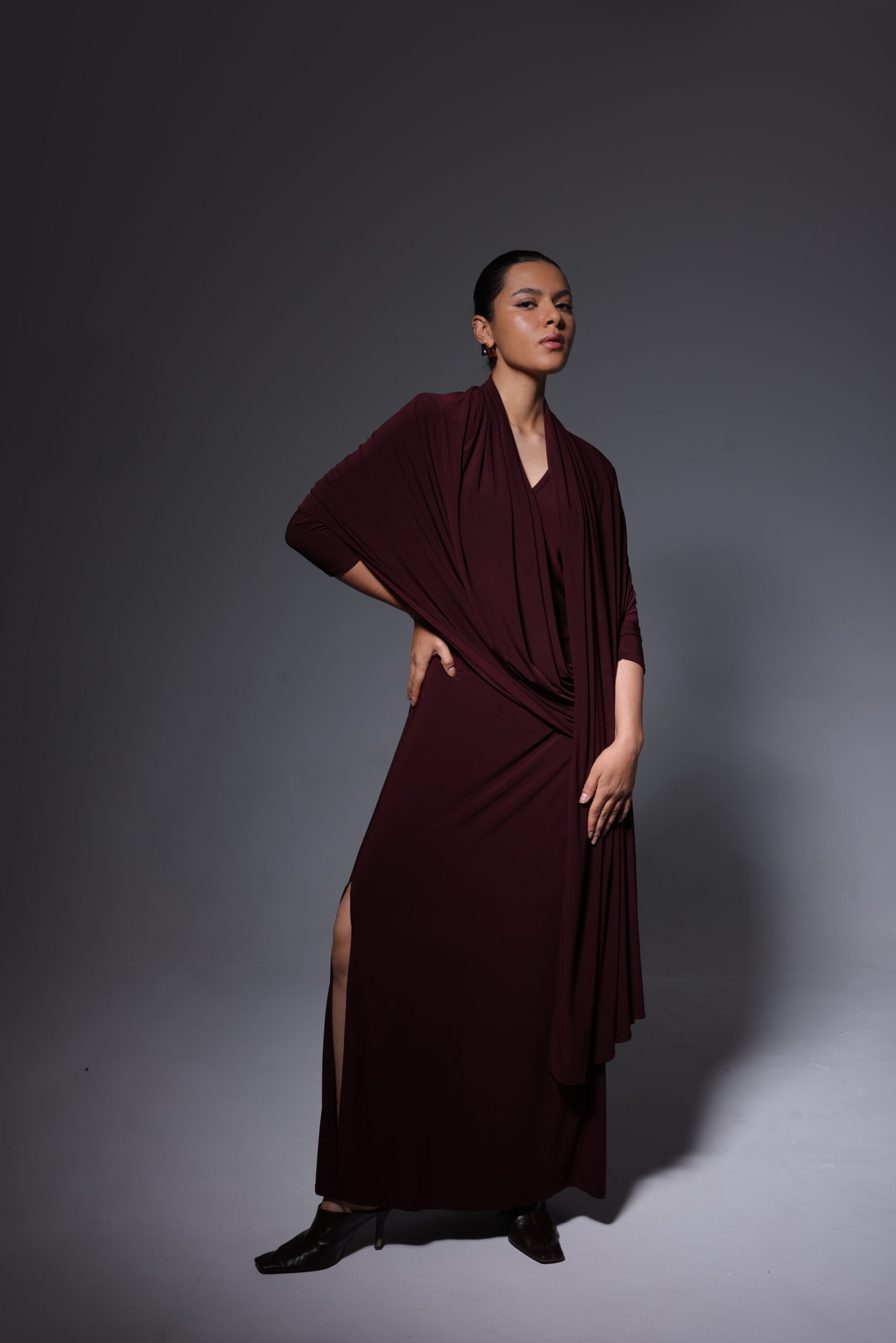A flowing deep-burgundy ensemble with soft draping and a graceful silhouette. Designed with a wrap-style bodice and relaxed sleeves, this look balances strength and elegance, creating a timeless statement for evening or special occasions