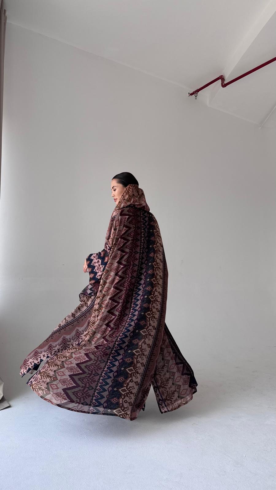 Sheer chiffon fabric with rich, interwoven tribal-inspired patterns in warm, earthy tones